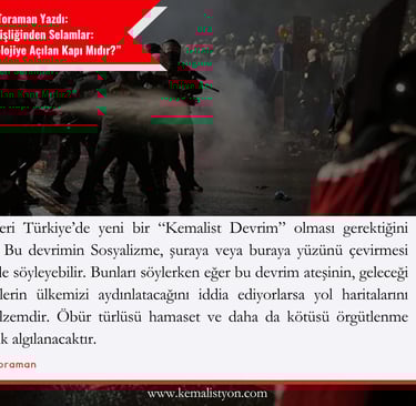 Sözün özü bizlerin “sözde” devrim idealiyle kendini ateşe atan gençlere müsaade etme lüksümüz yok. Devrim yapmak idealiyle yola çıkıp, rasyonel yol haritasından bir haber şekilde duvara toslayıp, yanında götürdüğü 20 ateş parçasını söndüren ve mücadeleye küstüren oluşumlara müsaade etme lüksümüz yok. Bizler anti emperyalist, anti faşist, ulus bilinci gelişmiş, ilerici ve tam bağımsız Kemalistleriz. Kemalist devrimi tekrar ifa etmemiz gerekiyorsa bunun yolu, üreten, kendini yetiştirmiş aydın Kemalistlerle dolu bir örgüt kurmaktan geçer.